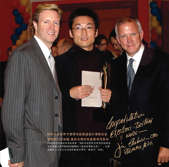 点精设计总监周兴有荣获“国际电视宣传与营销电视频道设计者联合会PROMAX&BDA《最佳荧幕标志奖》”,国际电视宣传与营销电视频道设计者联合会主席吉姆查宾为周兴有亲自颁奖并书写贺词。
