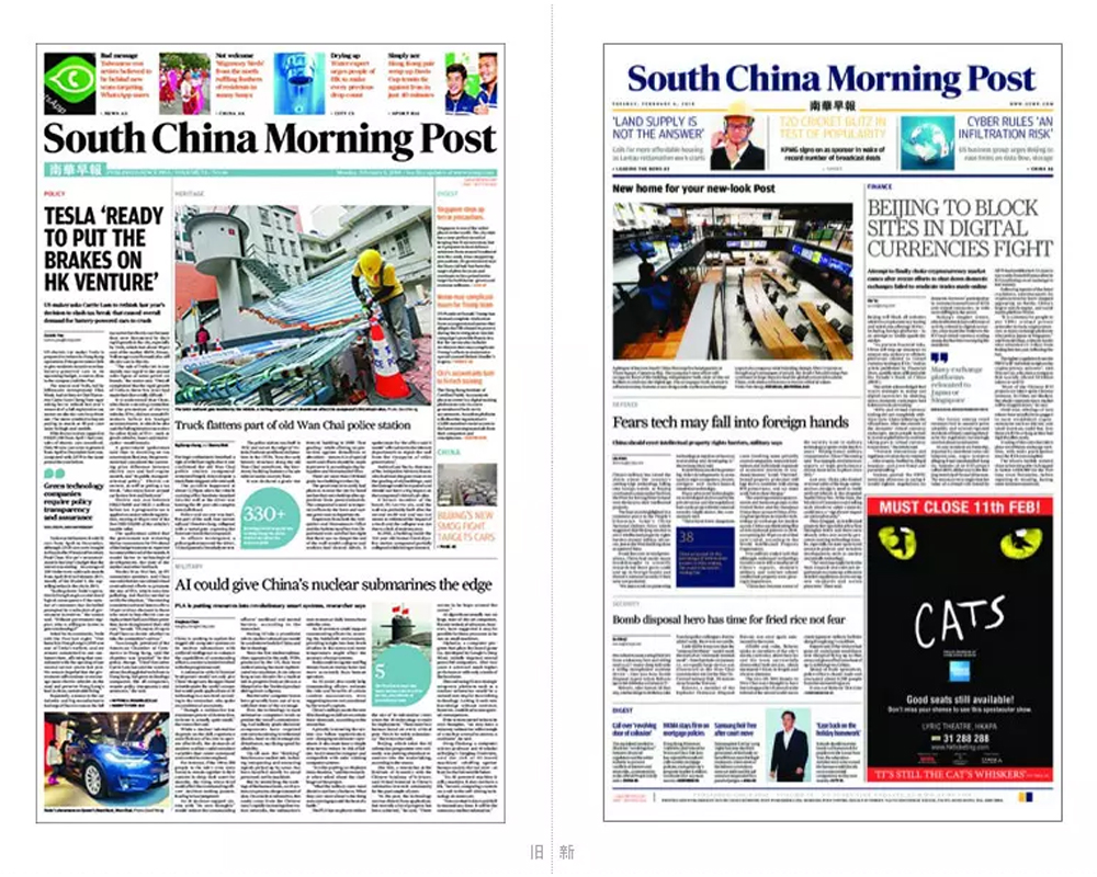 《南华早报》报纸新旧排版对比。