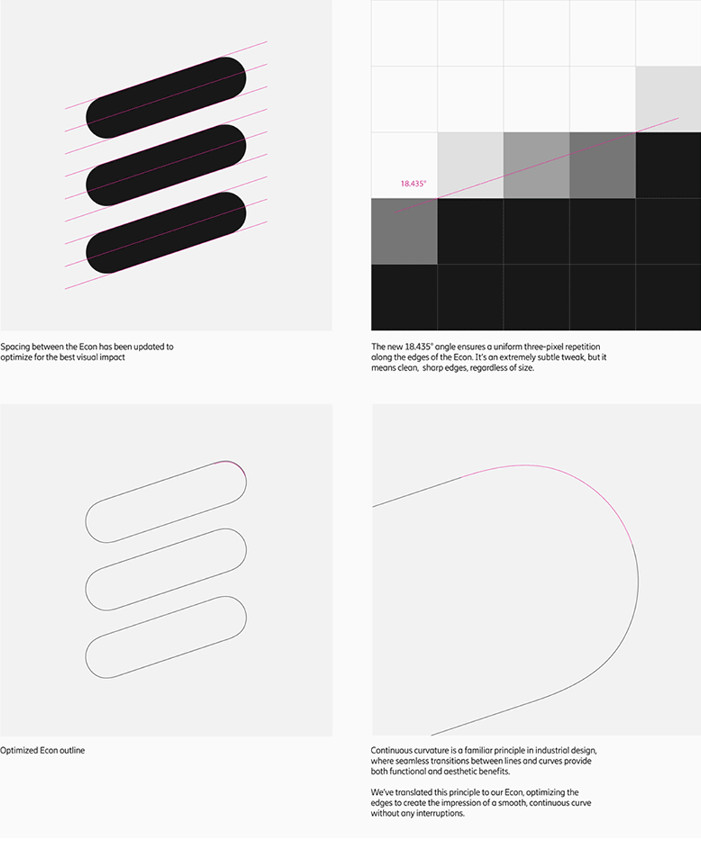 据了解,此次爱立信品牌微调由来自瑞典首都斯德哥尔摩(Stockholm)的一家品牌设计实验工作室Stockholm Design Lab设计完成。经过优化调整后的全新图形标识能够与像素网格平滑自然地对齐,并调整了三条圆角斜杠的角度,让其能够在数字环境中变的更加清晰锋利,尤其是在较小尺寸的平面中,这种展现尤为重要。