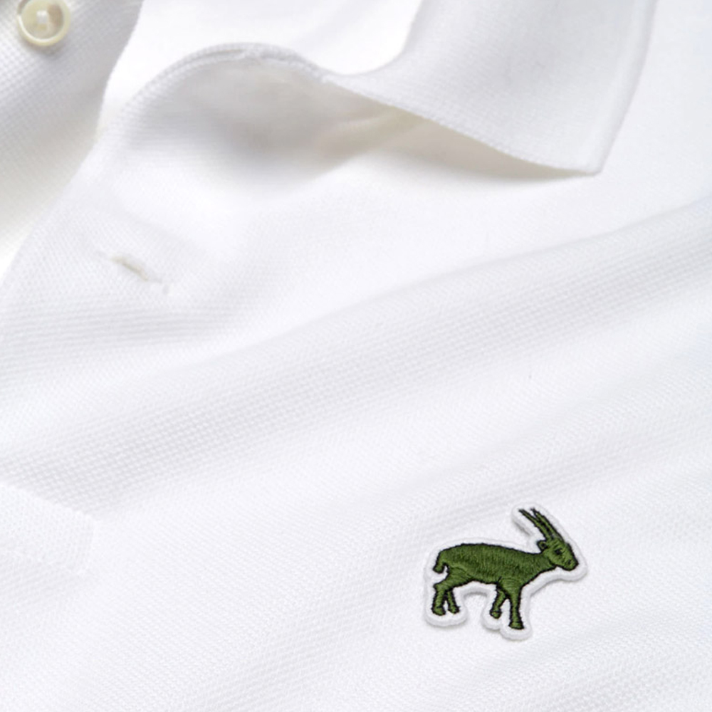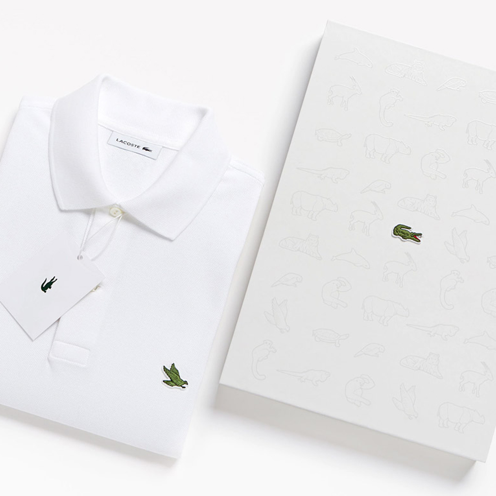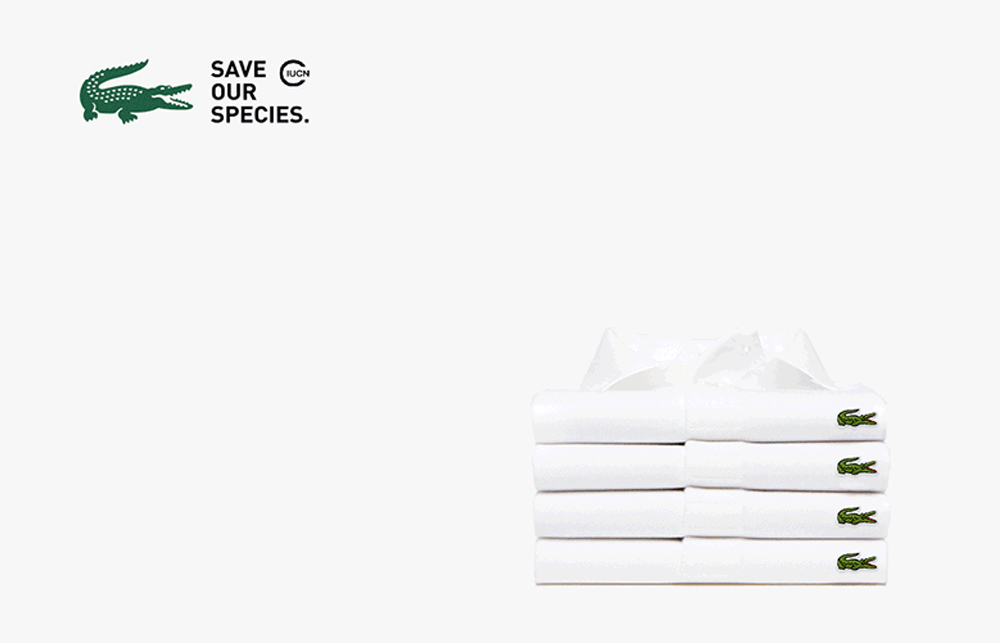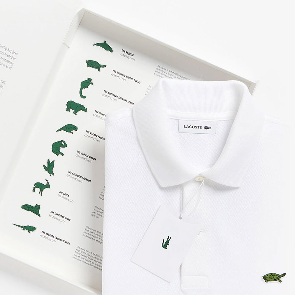 Lacoste将经典白色polo衫胸前全球驰名的绿色鳄鱼logo,更换成苏门答腊虎、爪哇犀牛和东部黑冠长臂猿,这批限量商品是Lacoste与保育团体“拯救地球物种”(Save Our Species)联手进行的慈善活动。