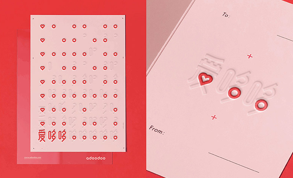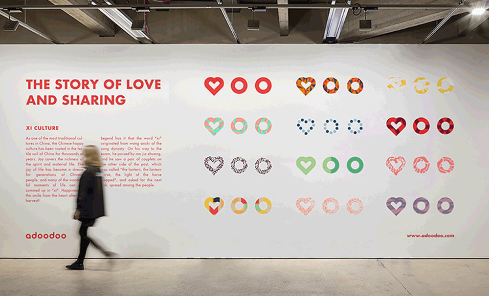 设计通过对文字字体的再设计,巧妙的提取了具有和爱哆哆文字含义一致的“心点点”的符号,将原本单一枯燥的字体文字转化成了轻松活泼的视觉图形,“更多爱”,“爱无限”的丰富内涵也与品牌的文化和精神完美契合。
