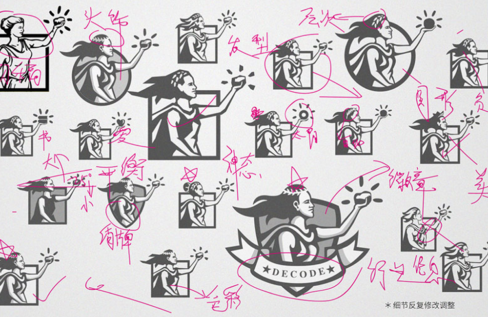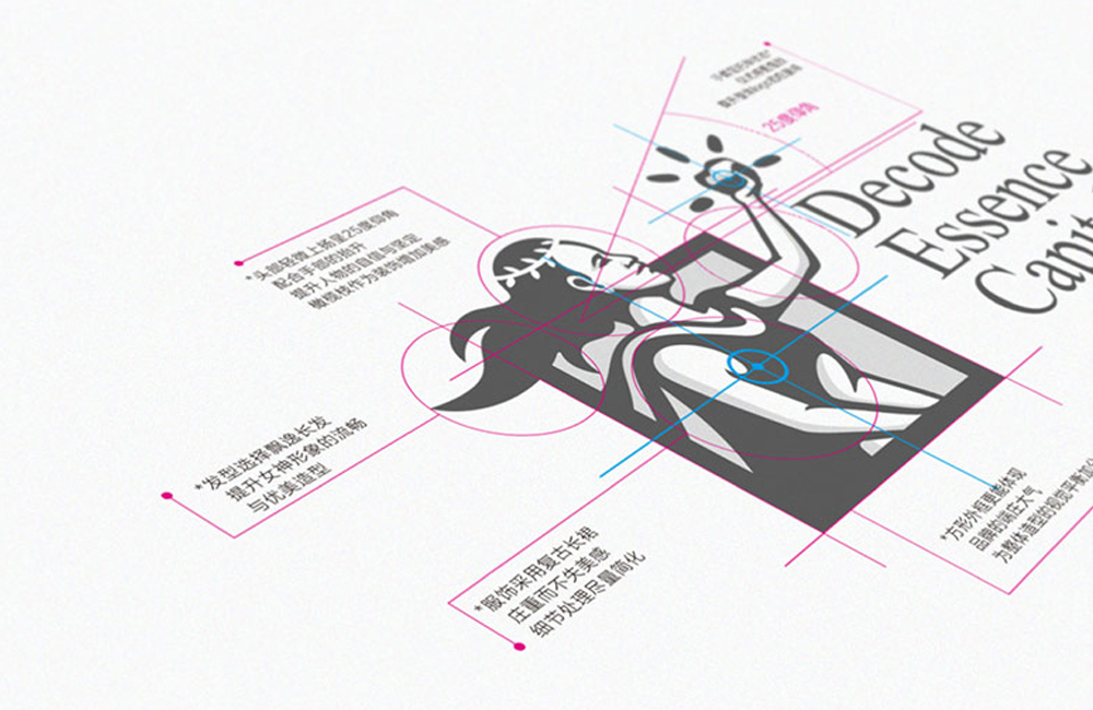 接下来的工作就是将画面进行视觉呈现,在设计过程中反复调整女神的姿态和神态,对服饰、发型、眼神、手臂的高度等每一个细节都进行了无数次的调整和实验,尽最大力量将女神的形象做到完美。 后期团队对品牌的色彩、辅助图形进行深化细致的调整,最终为客户呈现了完美的全新形象。集团领导层也非常认可硕谷设计团队的作品,给予了很高的评价。