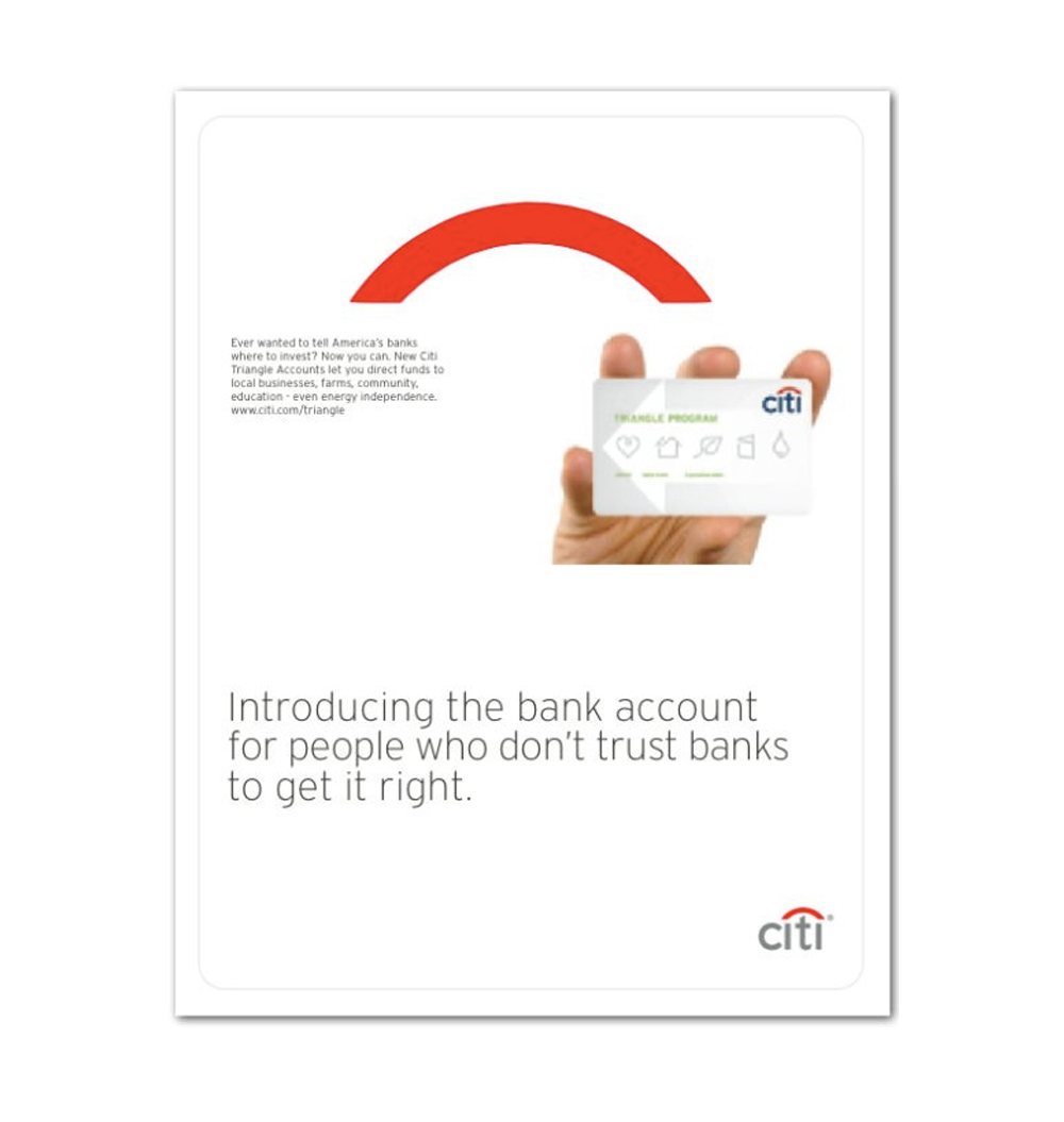 (3)截取图形标志的部分元素 利用“完形心理”,使用标志图形的局部并进行放大,仍然能够让人联想起品牌标志,同时截取的部分图形也让人注意到图形标志的独特性和美感。这是一种受到多数品牌欢迎的辅助图形创建方法。 CITI银行的广告简洁大气,但统一延用了标识的核心基因——代表伞的红色圆弧,显得很聚焦且有品牌识别力。