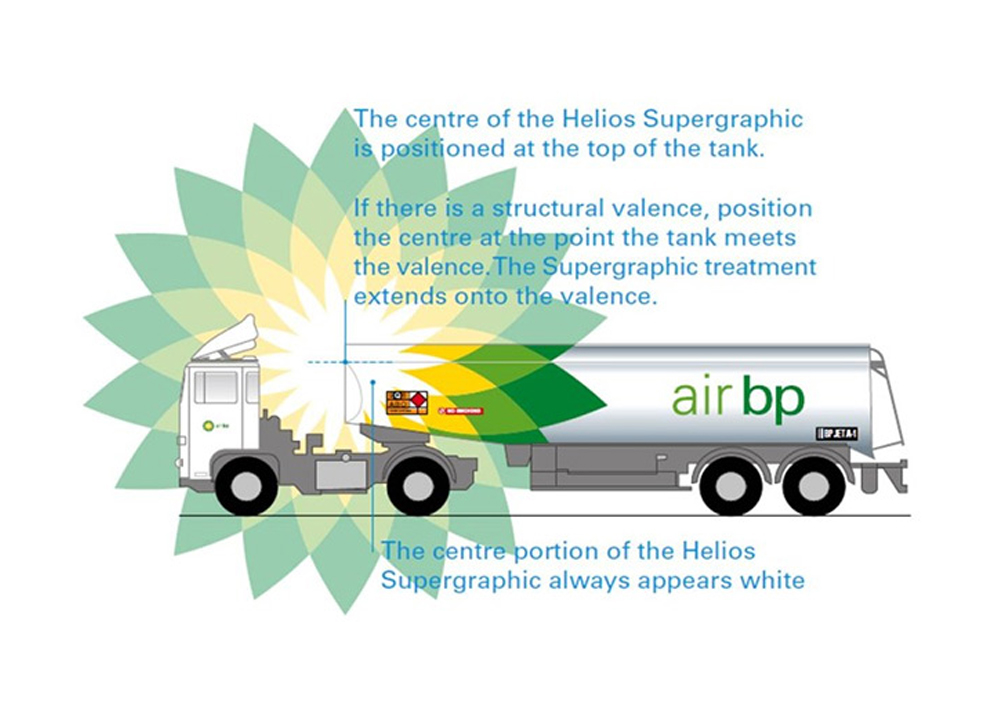 BP石油的品牌辅助图形,就采用以“严格”标准截取“太阳花”品牌图形标志局部的方式。