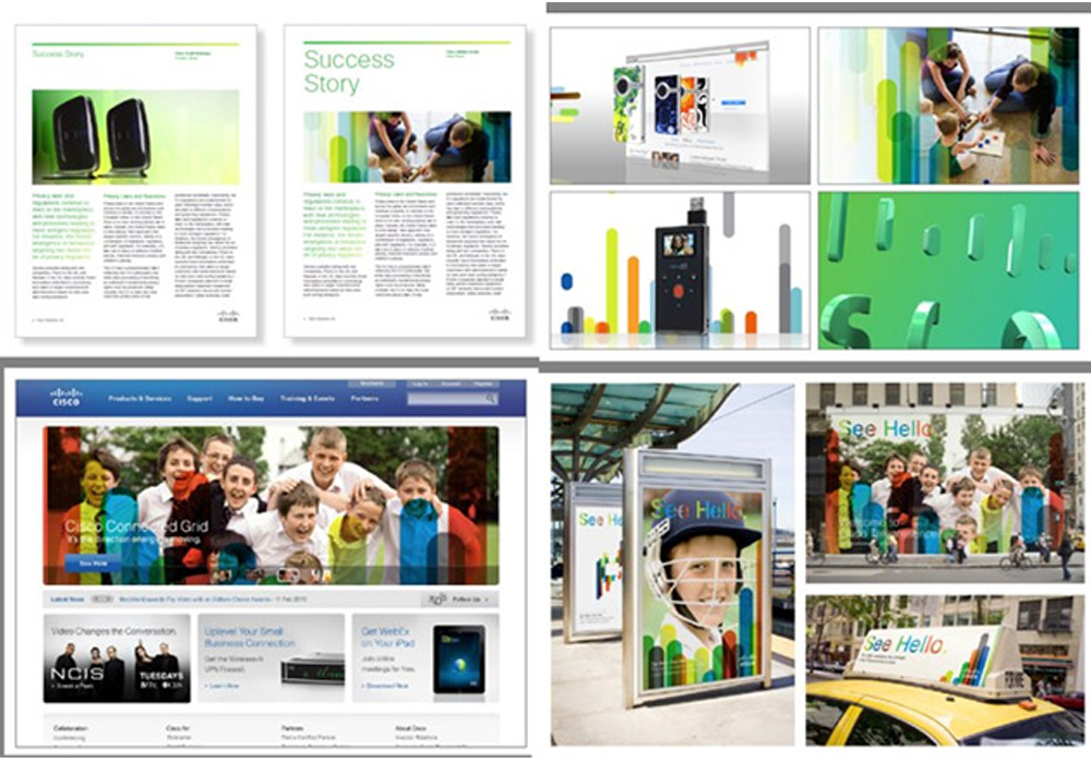 思科把品牌辅助色与辅助图形进行紧密结合,其辅助图形对品牌视觉识别起到了更为关键的作用。该辅助图形的基本构成元素来自品牌标志中的“栅栏”条形元素,表达品牌活力、能量、向上运动、进步的意念信息。该图形和品牌图形及文字组合,表达出鲜活丰富的品牌“表情”。思科的这个辅助图形被广泛运用于电视广告、网站、户外广告、产品包装、画册、展览展示等几乎所有的品牌传播工具中,既丰富了视觉效果,也起到了统一品牌形象的作用,从而形成个性鲜明的品牌视觉主线。