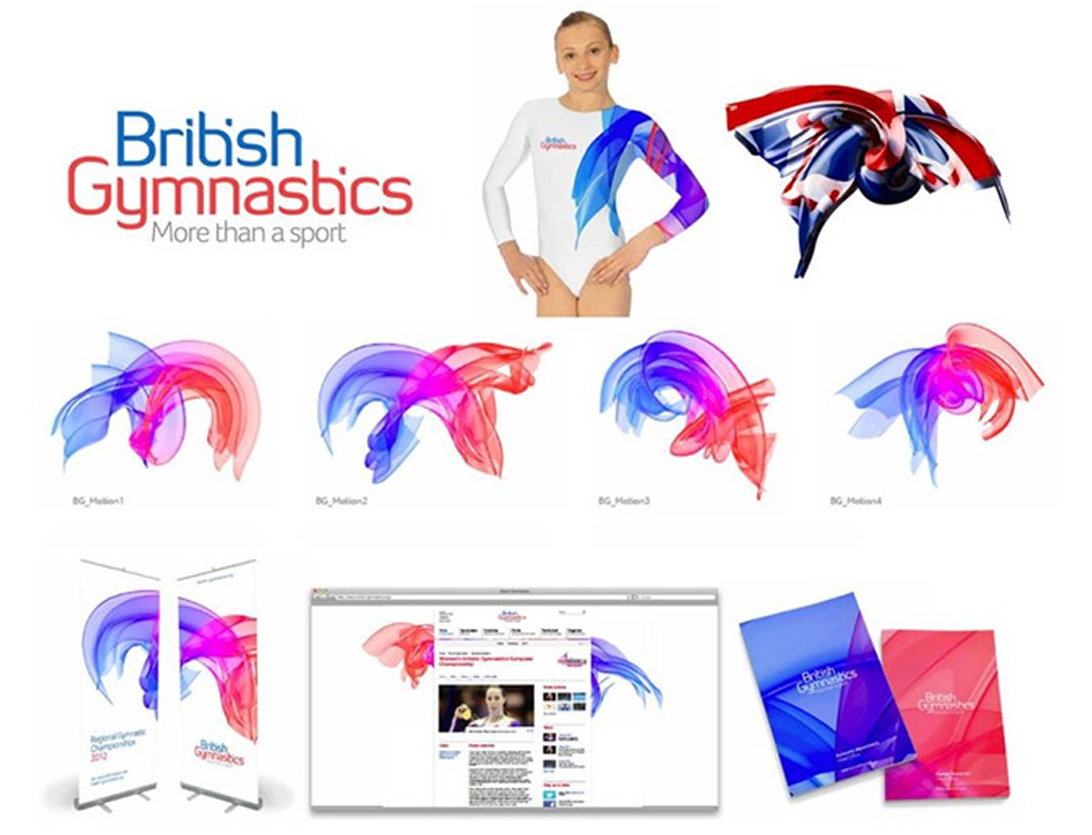 (6)重新设计与标志不相关,但与品类高度相关的辅助图形 此种情形多数适合仅有文字标志的品牌。辅助图形在一定程度上发挥了图形标志的识别作用,但又比图形标志在运用上拥有更多灵活性,如英国体操协会的标志。 英国体操(British Gymnastics)是一个非营利性的体操项目管理组织,原名为英国业余体操运动员协会,1997年更名为英国体操,其历史可以追溯到1888年。2012年6月份英国体操推出了全新的视觉标志,并在2012利物浦英国体操锦标赛中首次亮相。新标志通过捕捉运动员的各种运动过程,通过技术处理将这些运动轨迹制作成色彩斑斓的飘带。