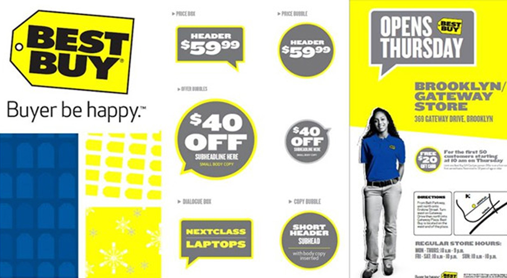 (7)采用多种辅助图形给予每种辅助图形不同的功能、用途 百思买标志的主色为黄色、蓝色,辅助色为黑色、灰色和红色。该品牌辅助图形包括“标签图形”“对话框”“文本气泡”“价格框”“价格气泡”“标题区”等多样化的运用形式,每一种形式都有不同的目的和内容规范相对应。 其中,“标签图形”与该品牌标志中的“商标图形”外形保持一致,只是在作为辅助图形运用时,商标图形可以被转变成品牌色盘中的其他颜色,图形角度也可沿着轴心向东任意方向旋转。