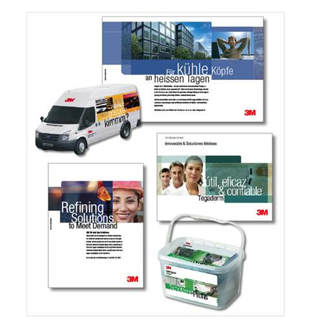“蒙太奇”在字典中的解释是“在一个合成布局中组合多种来源图片要素的技巧……作为照片或印刷品的片段,给人以这些要素原本就在一起的错觉,或者使各个要素保持各自的特性,作为增强组合影响或意义的方式”。 3M品牌标识系统把蒙太奇作为中心设计要素。它在呈现整个3M品牌统一的视像、声音的同时,传达了3M众多产品和品牌的独特含义。 创作蒙太奇就是将一组特定的透明形状或图片框组合或分层处理的过程。这些形状包含图像或色块。将这些在彼此上方移动时,就会交叠而产生新的形状,不同的图片框就开始以新的或未预料的方式联系起来。在3M看来:“这些未预料的发现就是使3M为人所熟知的创新核心。这将能以一贯的新方式展示3M的产品线或计划,同时成为一致的3M品牌含义的基础。” 3M蒙太奇要素主要由蒙太奇区域、蒙太奇图像构成。图像要素包括了产品、图案。此外,完整的3M蒙太奇还包括信息文字、圆角、轴线、色彩等元素,且对每一种构成元素均有明确的选择和使用要求。