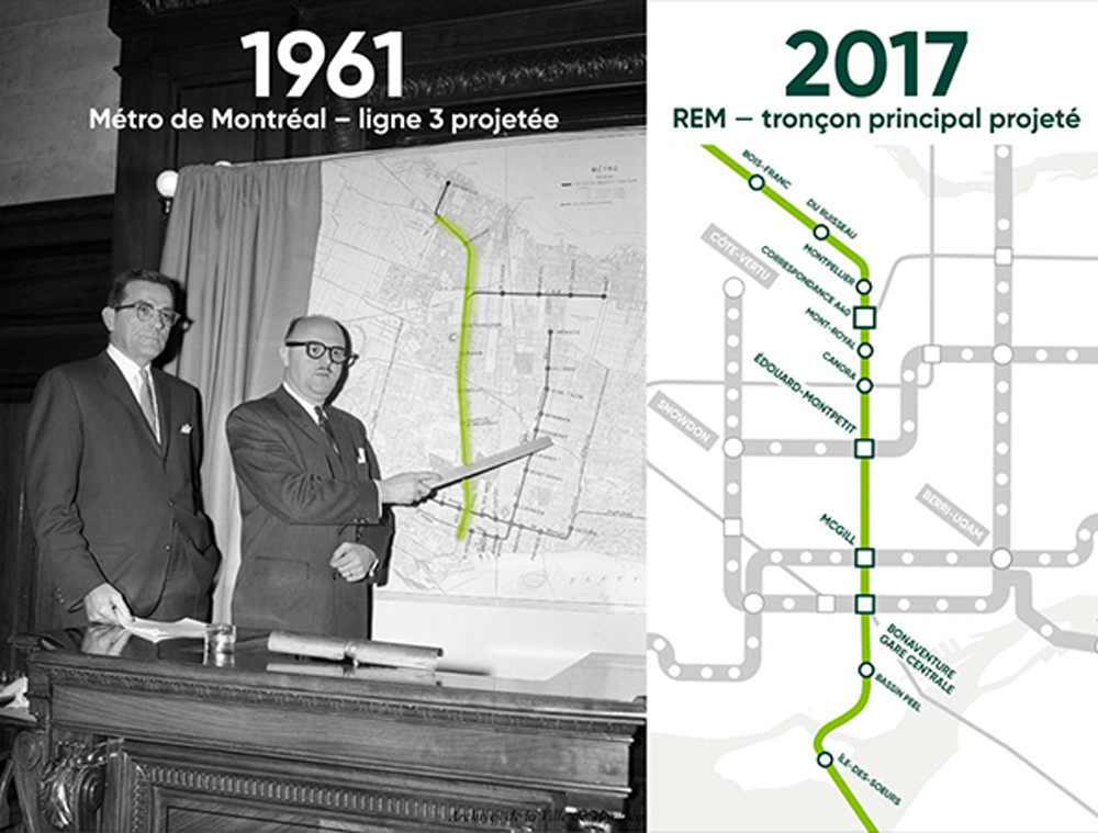 设计师考虑用红色作为REM标识的主色,是出于想对1961年JeanDrapeau设想的那条并未被建造的地铁线路致敬。