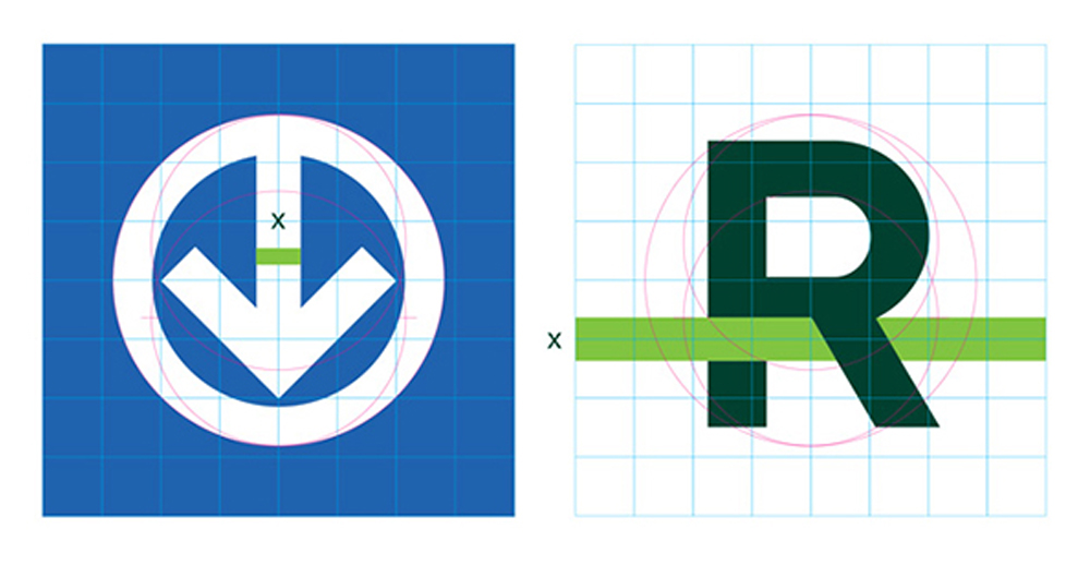 在标识中,这条线与字母R明显地结合在一起,从上方穿过字母R,再被字母R覆盖,再从下面穿出,这个动作说明了REM线路的地上部分和地下部分。