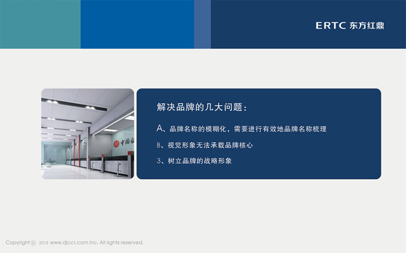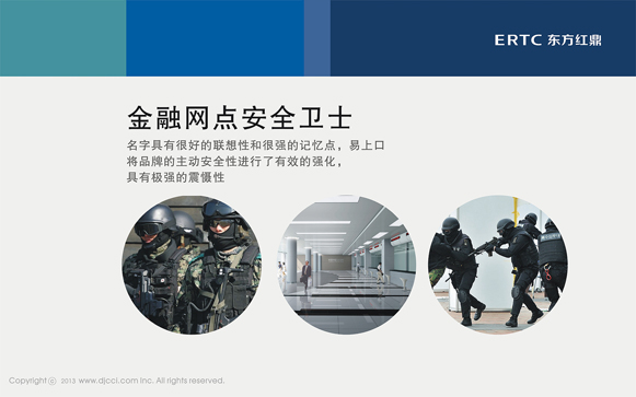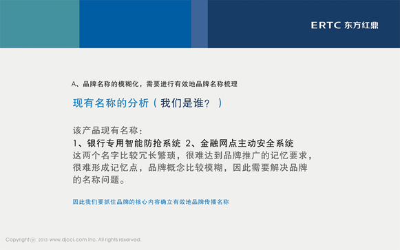 该产品现有名称:1、银行专用智能防抢系统  2、金融网点主动安全系统,这两个名字比较冗长繁琐,很难达到品牌推广的记忆要求,很难形成记忆点,品牌概念比较模糊,因此需要解决品牌的名称问题。因此我们要抓住品牌的核心内容确立有效地品牌传播名称,