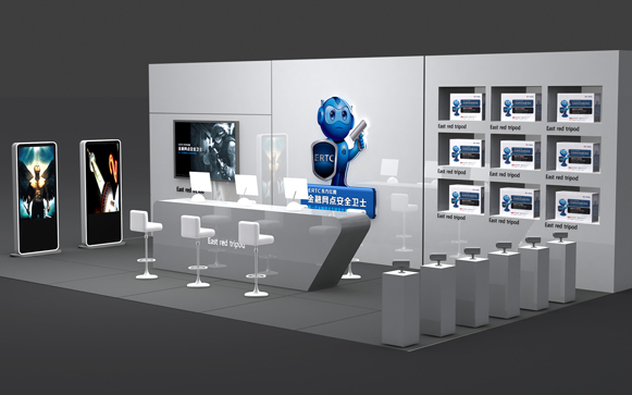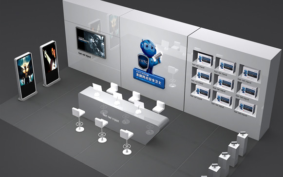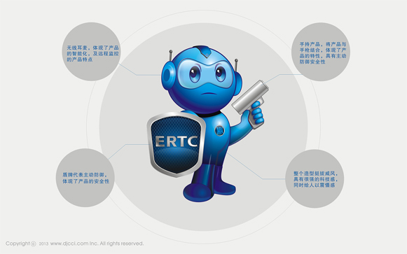 主形象设计为一个卡通的安全卫士的形象,他集科技,智能,人性,安全于一身,无线耳麦,体现了产品的智能化,及远程监控的产品特点,手持产品,将产品与手枪结合,体现了产品的特性,具有主动防御安全性,盾牌代表主动防御,体现了产品的安全性,整个造型挺拔威风,