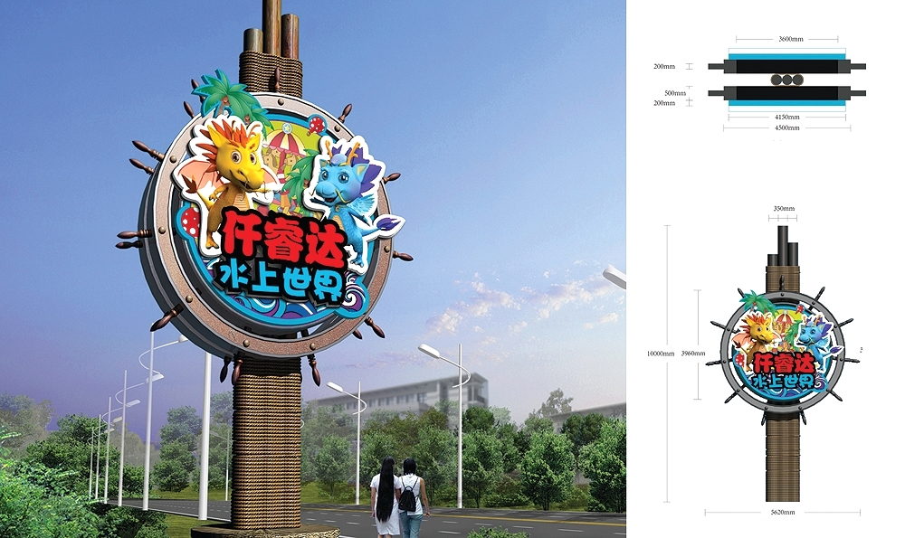 点精品牌设计公司为仟睿达水上世界塑造了品牌形象,形象标志容易让人直观联想起海洋,水滴,波浪或者是和水有关的东西,这样的设计更接近自然,欢快,更突出品牌的核心价值。进一步强调了仟睿达水上世界是一个水上的欢乐世界的品牌气质,导视设计采用船舵为主要元素,体现了来仟睿达水上世界,掌握欢乐的方向,驶向欢乐的世界