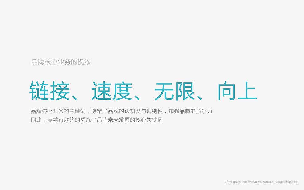 解决方案:如何区分传统电视,避免受众停留在传统有线电视的概念,强化依托于互联网宽带及无线网络业务的品牌和新视觉,品牌核心业务的提炼,链接、速度、无限、向上 ,品牌核心业务的关键词,决定了品牌的认知度与识别性,加强品牌的竞争力,因此,点精有效的的提炼了品牌未来发展的核心关键词,确立了准确而有效的品牌解决方案。