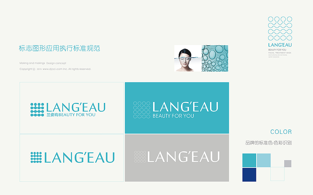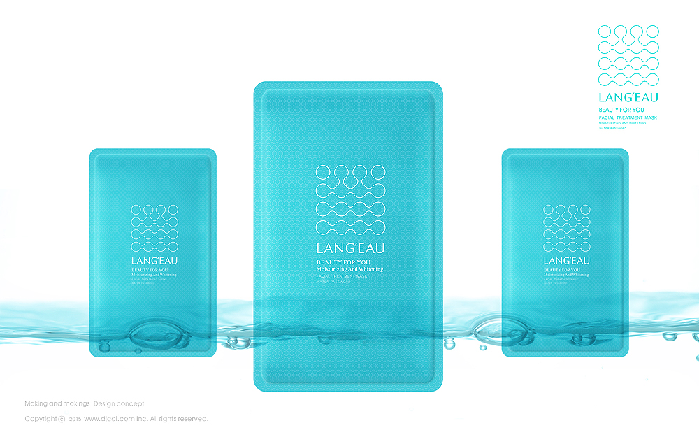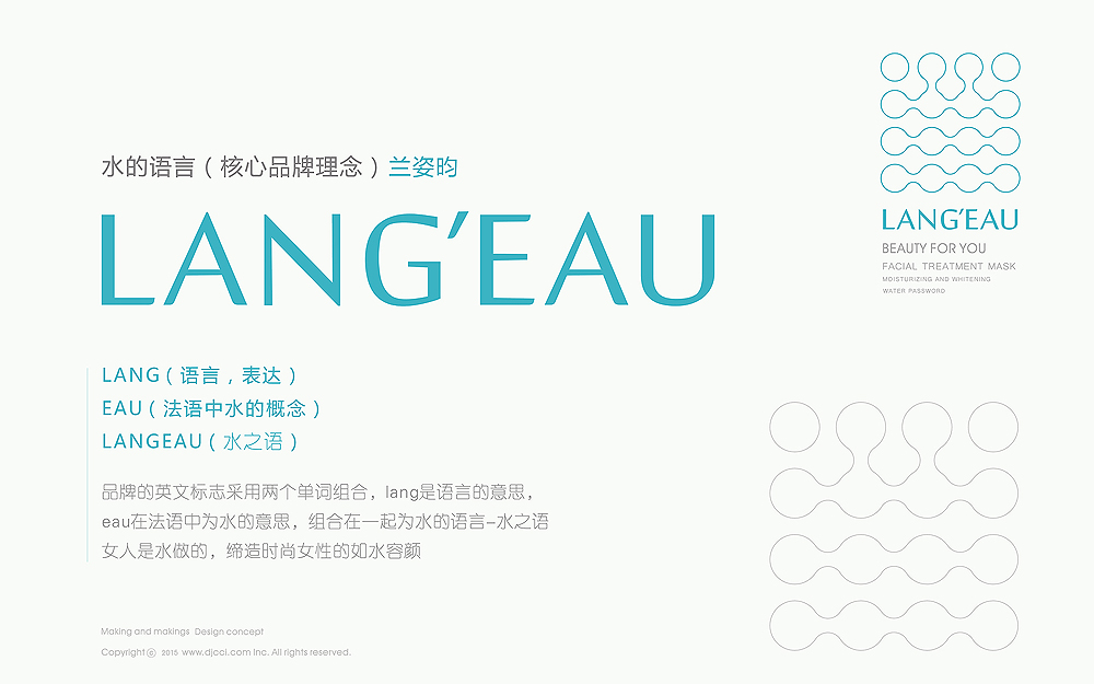 竞争的时代里,如何能够抓住视觉,就能提升效益,我们需要什么样品牌形象,才能从竞品中脱颖而出,具备核心价值的品牌命名,点精根据以下方向去探寻:具有与众大不同的个性识别符号,符合产品具有想象的色彩体系,将品牌的独特基因持续发展。品牌的核心元素及基因的探寻,我们追求一种与生俱来的品牌气质,女士美容面膜的核心价值,补水 美白 健康的国际气质,品牌的英文标志采用两个单词组合-lang-eau,lang是语言的意思,eau在法语中为水的意思,组合在一起为水的语言-水之语女人是水做的,缔造时尚女性的如水容颜。我们确立了以英文为主标识,图形为辅助视觉元素的方案,辅助视觉元素用水分子组合而成汉字“兰”,“兰”与水是兰姿昀品牌的核心传达元素.