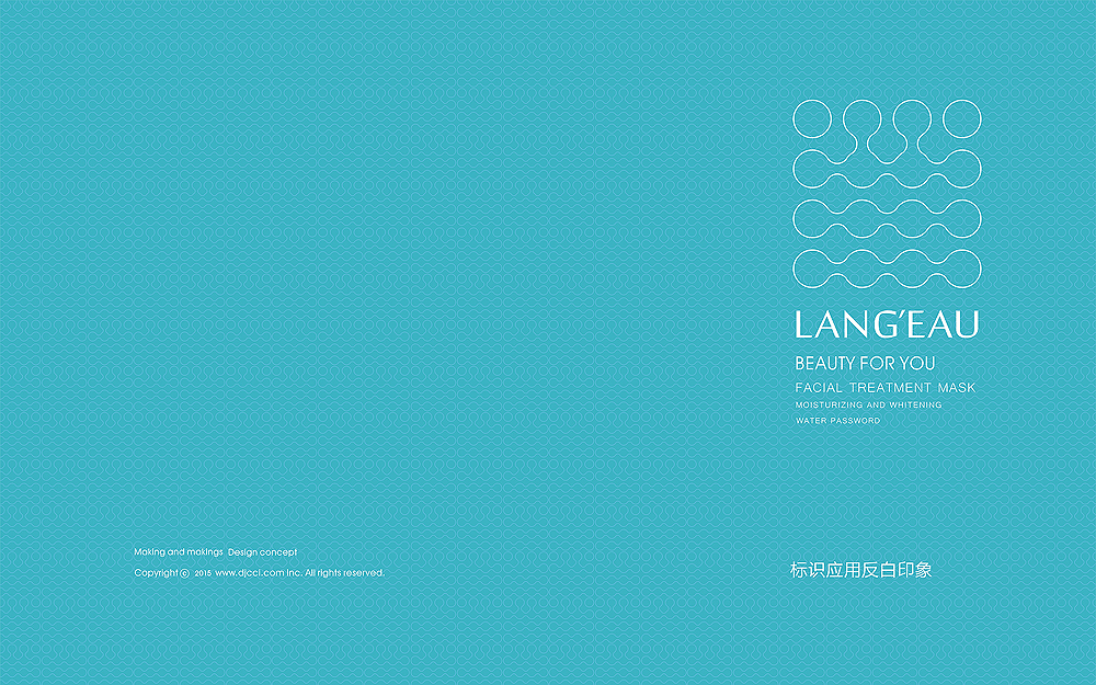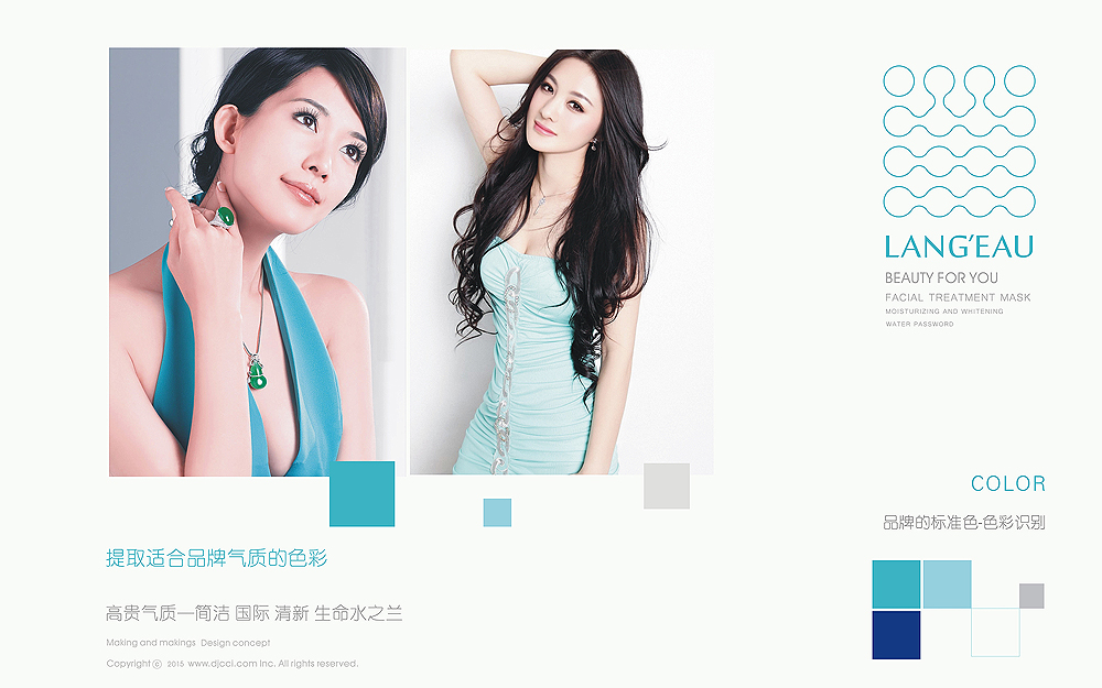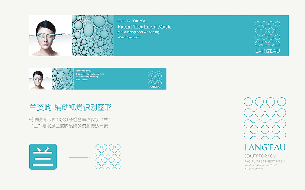 竞争的时代里,如何能够抓住视觉,就能提升效益,我们需要什么样品牌形象,才能从竞品中脱颖而出,具备核心价值的品牌命名,点精根据以下方向去探寻:具有与众大不同的个性识别符号,符合产品具有想象的色彩体系,将品牌的独特基因持续发展。品牌的核心元素及基因的探寻,我们追求一种与生俱来的品牌气质,女士美容面膜的核心价值,补水 美白 健康的国际气质,品牌的英文标志采用两个单词组合-lang-eau,lang是语言的意思,eau在法语中为水的意思,组合在一起为水的语言-水之语女人是水做的,缔造时尚女性的如水容颜。我们确立了以英文为主标识,图形为辅助视觉元素的方案,辅助视觉元素用水分子组合而成汉字“兰”,“兰”与水是兰姿昀品牌的核心传达元素.